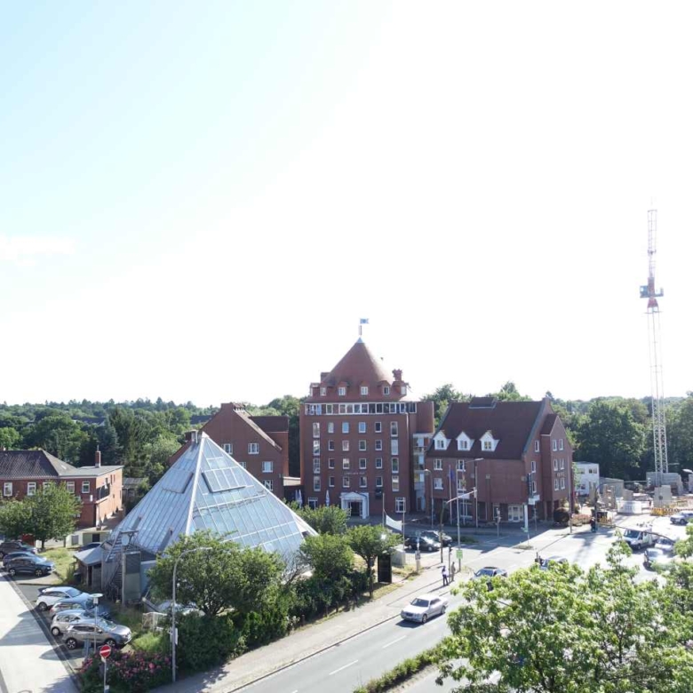 Große Fenster lassen viel Tageslicht herein und bieten einen weiten Blick über die Dächer der